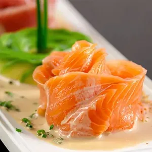 Salmón furai, palta envuelto en nori tempurizado coronado con crema de queso y salmón ahumado ahumado, orégano, láminas de almendra, toques de ciboulette, shichimi y salsa dulce