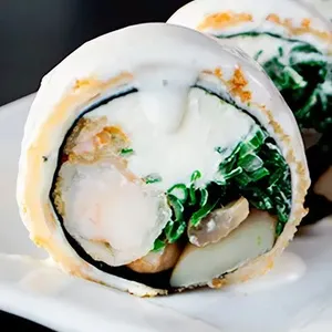 Camarón, queso crema, pimentón rojo envuelto en crispys, cubierto con salsa volcano (champiñón, camarón, cebollín flambeados con salsa tonkatsu y crema de leche) cubierto con queso mozzarella gratinado y toques de dulce