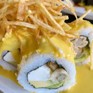 Salmón furai, queso crema envuelto en nori tempurizado, cubierto con topping de palta, coronado con camarones tempura, toques de ciboulette, shichimi y salsa honey